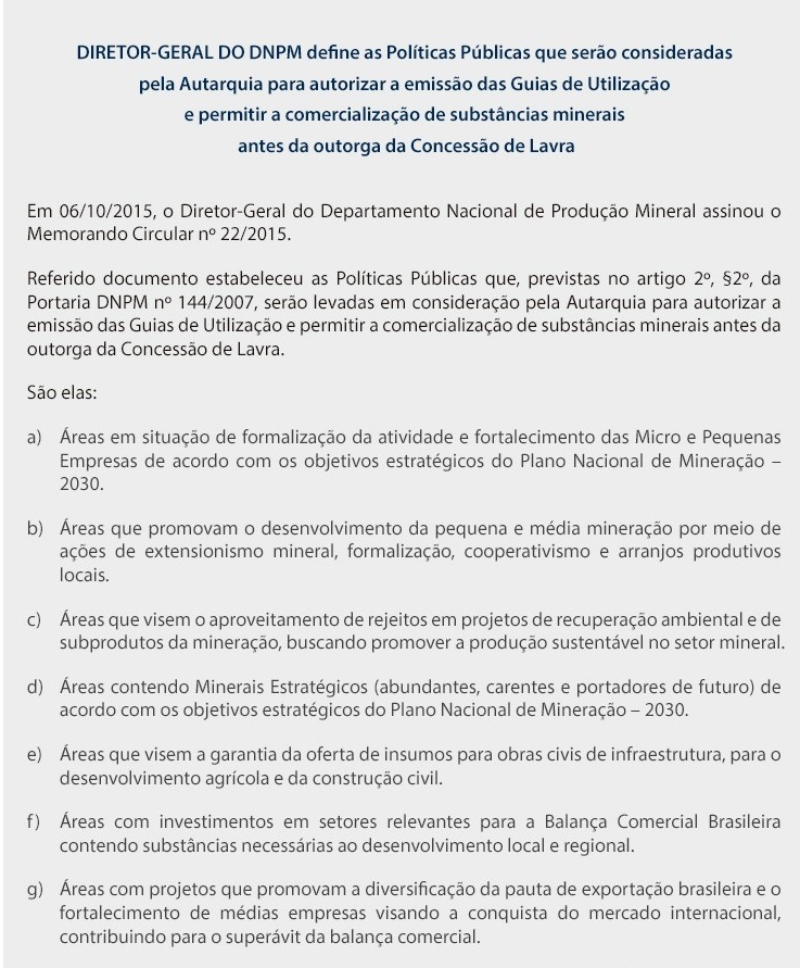 DIRETOR-GERAL DO DNPM DEFINE AS POLÍTICAS PÚBLICAS QUE SERÃO CONSIDERADAS PELA AUTARQUIA PARA AUTORIZAR A EMISSÃO DAS GUIAS DE UTILIZAÇÃO E PERMITIR A COMERCIALIZAÇÃO DE SUBSTÂNCIAS MINERAIS ANTES DA OUTORGA DA CONCESSÃO DE LAVRA